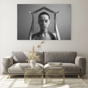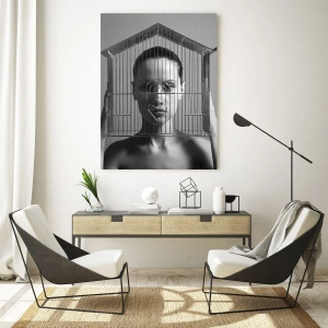Quadro su vetro - Donna con una gabbia a forma di casa sul viso in bianco e nero - 70x50cm - Ritratto un po' surreale - Decorazione murale moderna per soggiorno e camera da letto ARTTOR