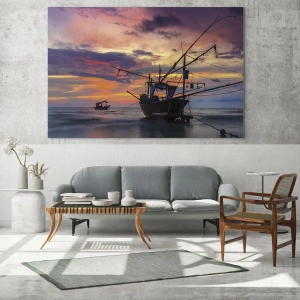 - Questo dipinto artistico raffigura barche da pesca su un mare calmo al tramonto. È l'elemento decorativo perfetto per interni che valorizzano l'armonia e la bellezza della natura.