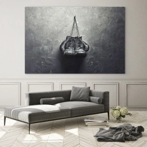 Quadro su vetro - Guantoni da boxe neri appesi al muro - 50x70cm - Tempo di lotte e tempo di pace - Decorazione murale moderna per soggiorno e camera da letto ARTTOR