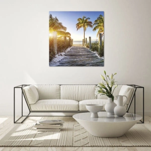 Quadro su vetro - Sentiero in legno sulla spiaggia con palme sullo sfondo - 80x120cm - Dritto in paradiso - Decorazione murale moderna per soggiorno e camera da letto ARTTOR