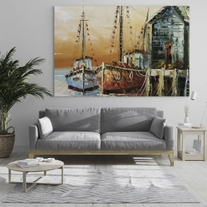 Quadro su vetro - Barche colorate al porto turistico - 50x70cm - Ritorno tranquillo - Decorazione murale moderna per soggiorno e camera da letto ARTTOR
