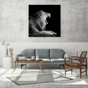 Quadro su vetro - Ritratto in bianco e nero di un leone che ruggisce contro un'ombra - 70x50cm - Senza alcun dubbio - Decorazione murale moderna per soggiorno e camera da letto ARTTOR