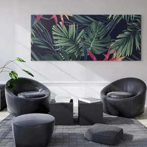 Quadro su vetro - Foglie e fiori tropicali su sfondo scuro - 80x120cm - Fiammante nel verde - Decorazione murale moderna per soggiorno e camera da letto ARTTOR