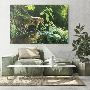 Quadro su vetro - Leopardo su una roccia nella giungla tropicale - 100x70cm - A caccia? - Decorazione murale moderna per soggiorno e camera da letto ARTTOR