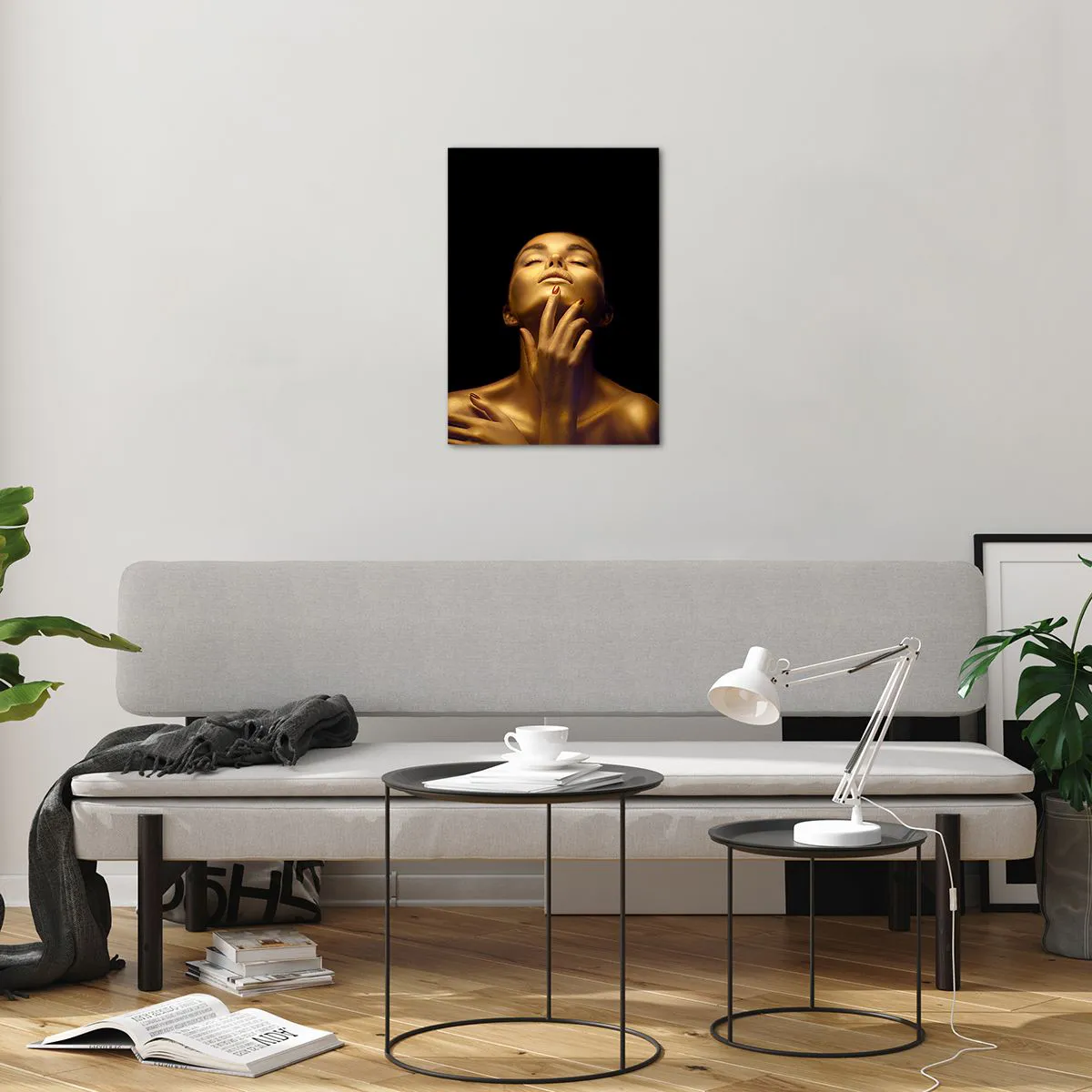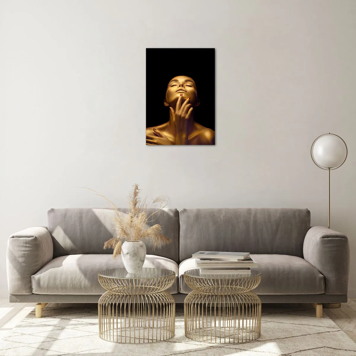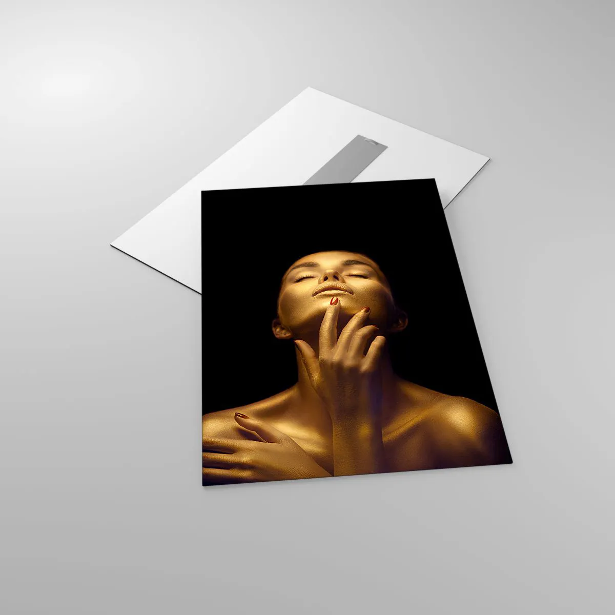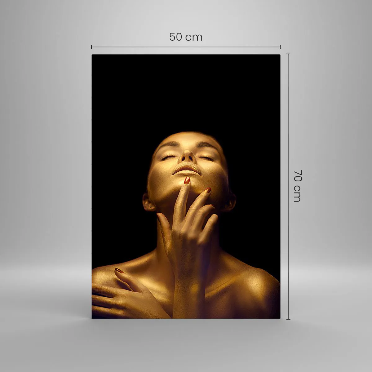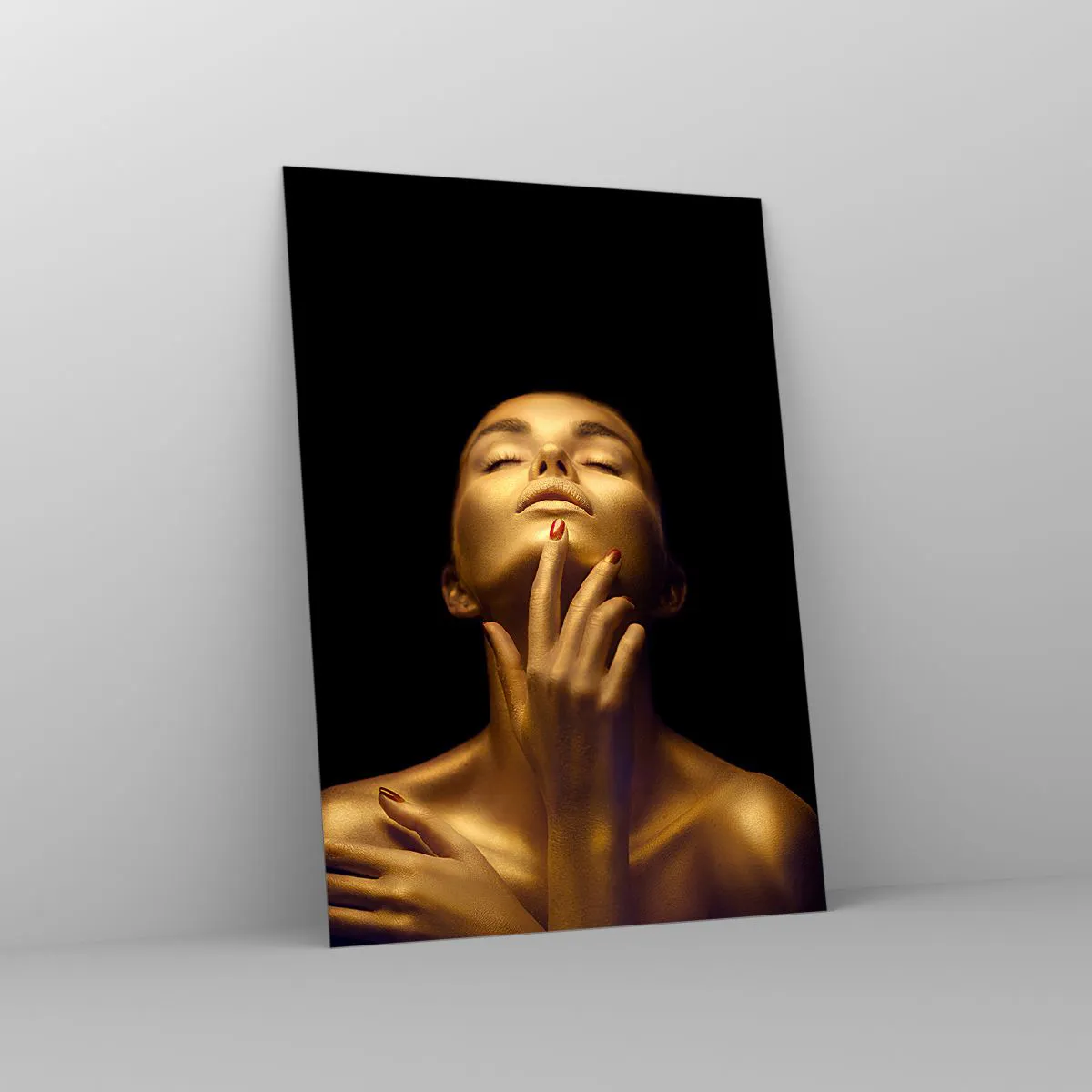 Quadro su vetro - Ritratto di una donna in tonalità dorate - 50x70cm - Come seta d'oro - Decorazione murale moderna per soggiorno e camera da letto ARTTOR