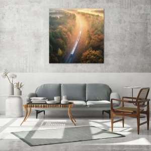La stampa su vetro garantisce dettagli precisi, evidenziando ogni elemento del paesaggio: foglie, treno e binari ferroviari. Questo dà vita al dipinto, catturando l'essenza di un viaggio tranquillo attraverso la natura circostante.