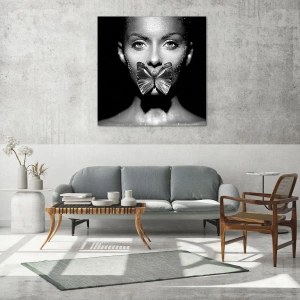 Quadro su vetro - Ritratto di una donna con una farfalla sulle labbra in bianco e nero - 120x80cm - Il bacio delle farfalle - Decorazione murale moderna per soggiorno e camera da letto ARTTOR