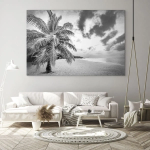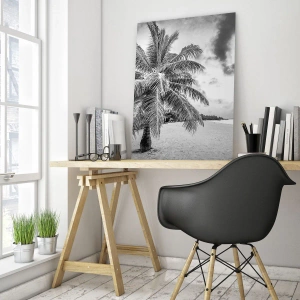 Quadro su vetro - Una palma bianca e nera su una spiaggia deserta con un cielo nuvoloso. - 70x50cm - Quando hai nostalgia della solitudine... - Decorazione murale moderna per soggiorno e camera da letto ARTTOR