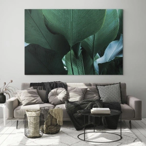 - Il dipinto raffigura grandi foglie tropicali in intense tonalità di verde. La composizione naturale, con le sue caratteristiche texture vegetali, porta all'interno la tranquillità, la profondità e la freschezza della natura tropicale.