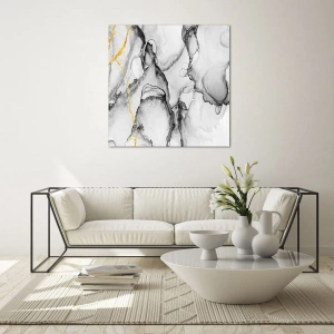 La pittura su vetro "Composizione con motivo dorato" delizia per la sua forma moderna e la straordinaria eleganza che scaturisce dal contrasto di colori e struttura. Striature di vernice bianche e nere e texture marmoree si intrecciano con linee e macchie dorate, creando un insieme unico e dinamico. Questo motivo cattura perfettamente lo spirito dell'arte contemporanea, in cui l'astrazione incontra dettagli lussuosi.