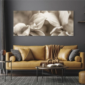 Quadro su vetro - Primo piano di fiori in una delicata tonalità seppia con contorni morbidi - 120x50cm - Mite come un sorriso - Decorazione murale moderna per soggiorno e camera da letto ARTTOR