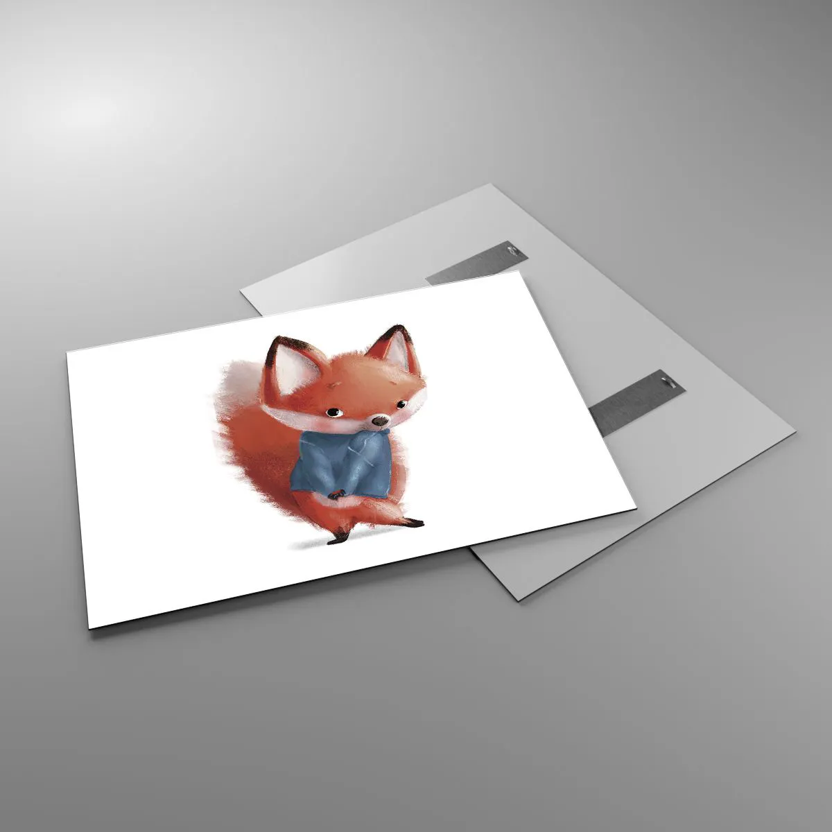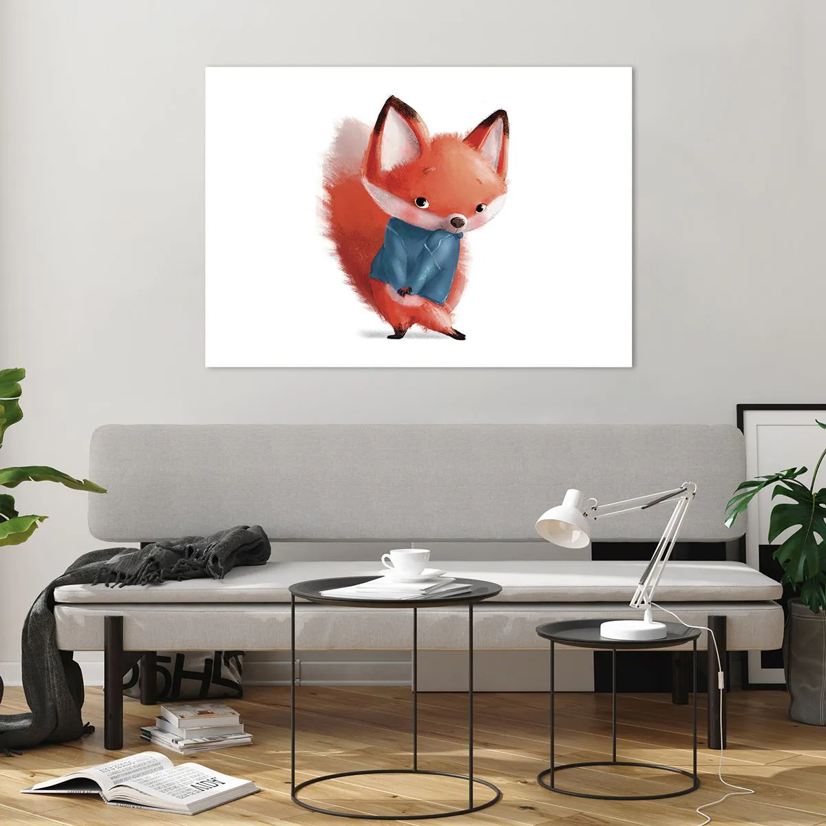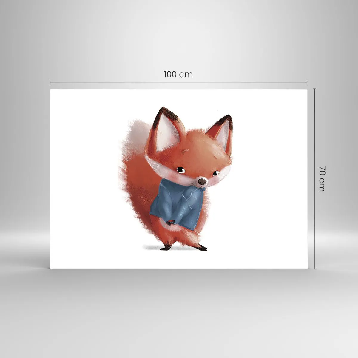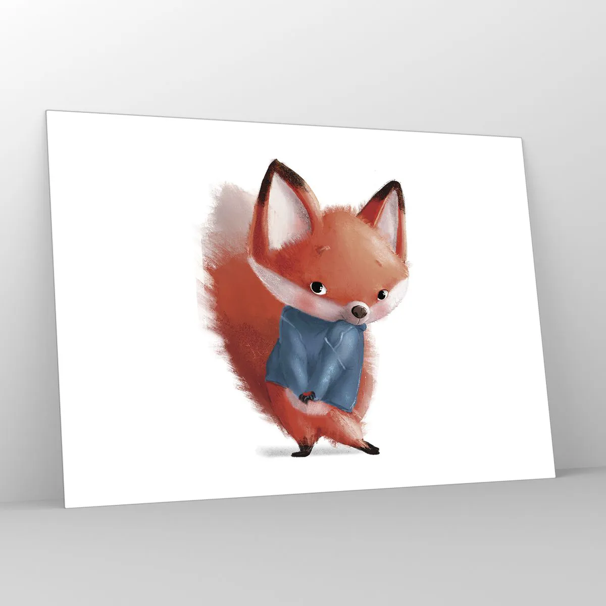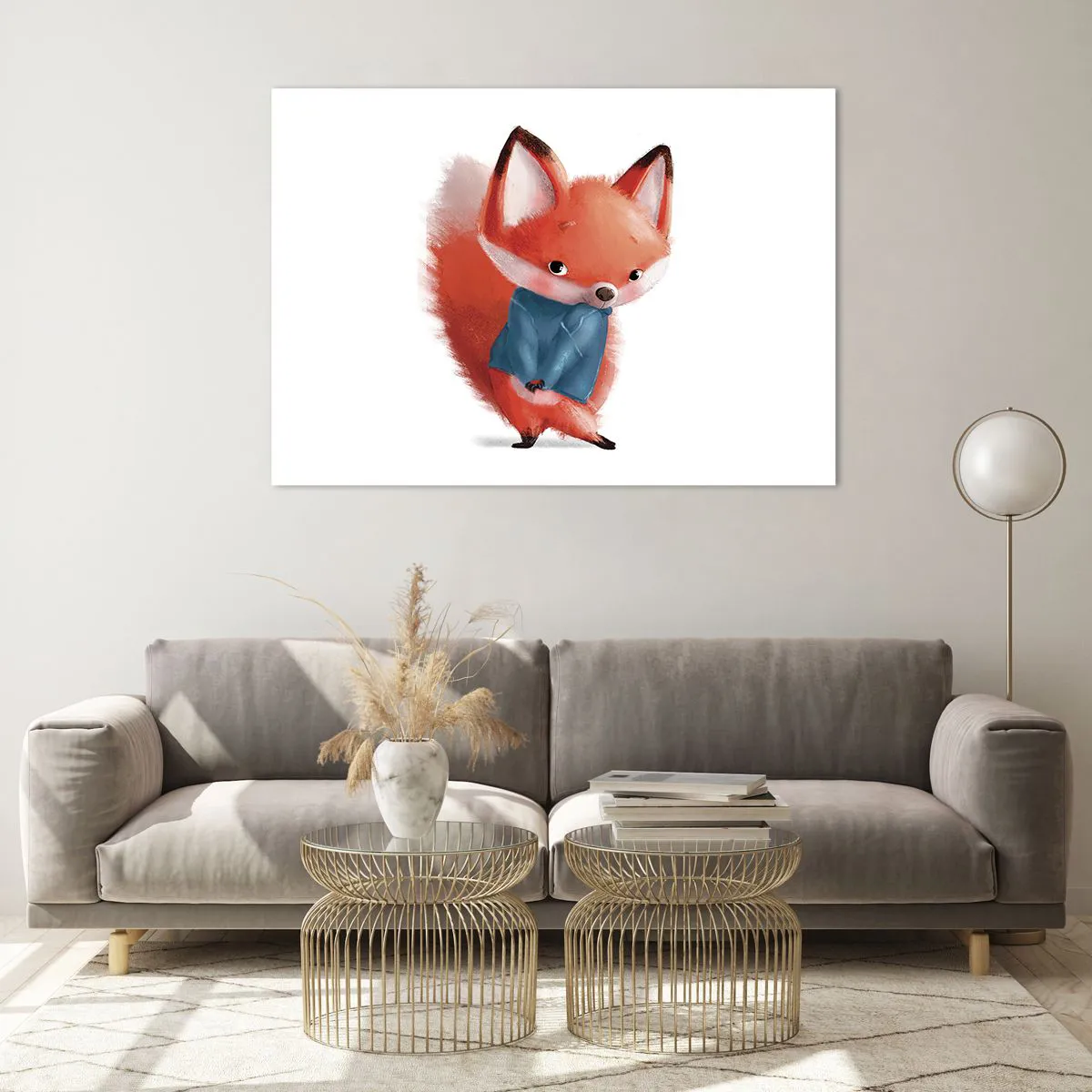 Quadro su vetro - Una simpatica volpe con un maglione blu su sfondo bianco - 100x70cm - Ci sto bene? - Decorazione murale moderna per soggiorno e camera da letto ARTTOR