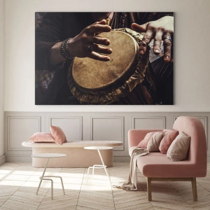 Quadro su vetro - Primo piano di mani che suonano un tamburo djembe in una luce calda. - 100x70cm - Al ritmo del cuore - Decorazione murale moderna per soggiorno e camera da letto ARTTOR