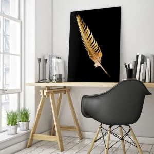 Quadro su vetro - Una piuma dorata su sfondo nero in stile minimalista - 50x70cm - Non una piuma qualsiasi.... - Decorazione murale moderna per soggiorno e camera da letto ARTTOR