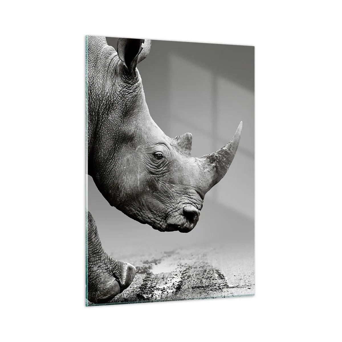 Quadro su vetro - Un rinoceronte in movimento su uno sfondo grigio - 50x70cm - Forza irrefrenabile - Decorazione murale moderna per soggiorno e camera da letto ARTTOR