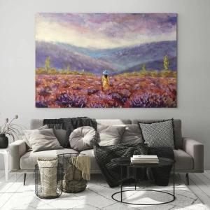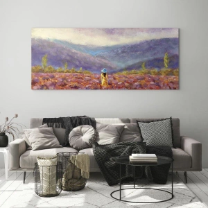 Quadro su vetro "Nel mondo della lavanda" raffigura un paesaggio suggestivo in cui una donna con un cappello cammina tra la lavanda illuminata dalla luce del sole al tramonto. Toni viola, colori caldi e un orizzonte montuoso creano una scena pittoresca e rilassante.