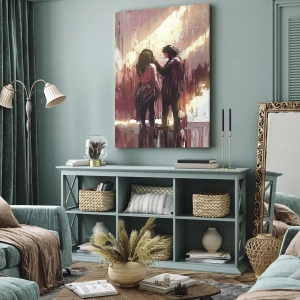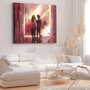 Quadro su tela - Stampe su Tela - Una coppia in piedi, illuminata da una luce calda, su uno sfondo di motivi astratti. - 100x70cm - L'eterno spettacolo dell'amore - Decorazione murale moderna per soggiorno e camera da letto ARTTOR