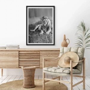 Poster in cornice nera - Leone appoggiato su una roccia in stile monocromatico - 100x70cm - La siesta del re - Decorazione murale moderna per soggiorno e camera da letto ARTTOR
