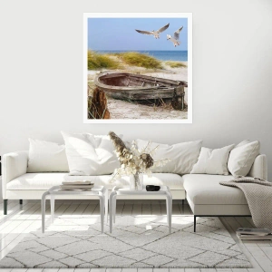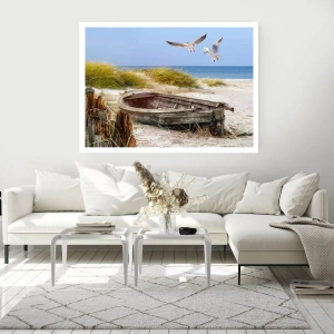 Poster - Barca abbandonata su una spiaggia con gabbiani - 100x70cm - Bagnate dal vento - Decorazione murale moderna per soggiorno e camera da letto ARTTOR