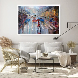 Poster - Una donna con un ombrello in una strada piovosa, illuminata dalle luci al neon. - 100x70cm - Pomeriggio di pioggia in città - Decorazione murale moderna per soggiorno e camera da letto ARTTOR