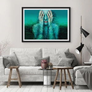 Poster in cornice nera - Una figura femminile con un motivo ad albero su uno sfondo paesaggistico turchese - 70x50cm - Immersa nel blu - Decorazione murale moderna per soggiorno e camera da letto ARTTOR