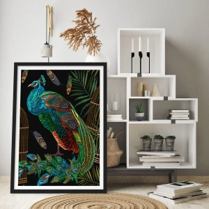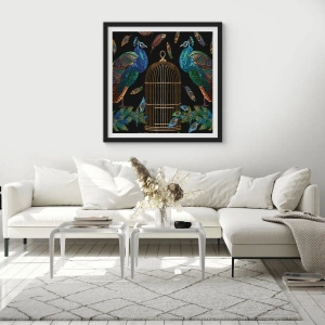 Poster in cornice nera - Pavoni accanto a una gabbia dorata su sfondo nero - 100x70cm - Con gli abiti reali - Decorazione murale moderna per soggiorno e camera da letto ARTTOR