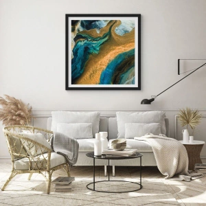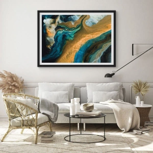 Poster in cornice nera - Una composizione astratta nei toni dell'oro e del blu. - 50x70cm - Blu-oro: influenza reciproca - Decorazione murale moderna per soggiorno e camera da letto ARTTOR