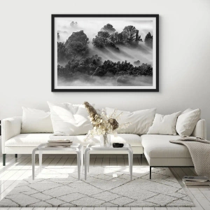 - Questo poster in bianco e nero raffigura una foresta avvolta nella nebbia, creando un'atmosfera tranquilla e misteriosa. Perfetto per gli amanti della natura e dell'eleganza minimalista.