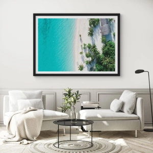 Poster in cornice nera - Una vista a volo d'uccello di una spiaggia tropicale con acqua turchese e palme - 70x50cm - Vacanze in paradiso - Decorazione murale moderna per soggiorno e camera da letto ARTTOR