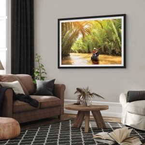 Poster in cornice nera - Una barca su un fiume circondata da vegetazione tropicale - 70x50cm - Tunnel di palme - Decorazione murale moderna per soggiorno e camera da letto ARTTOR