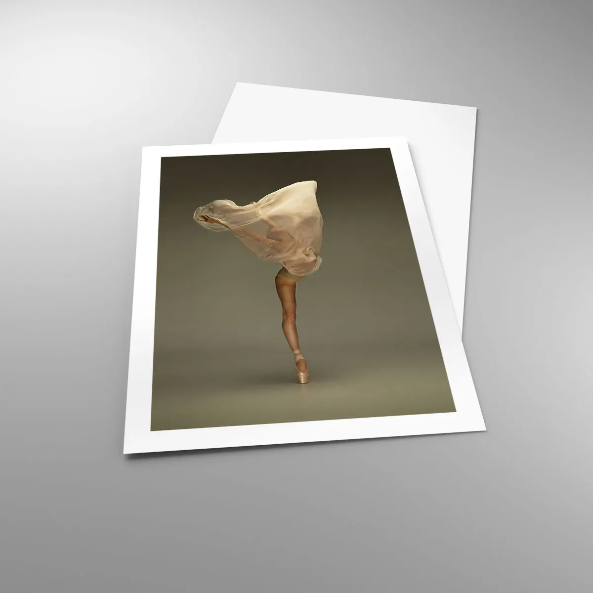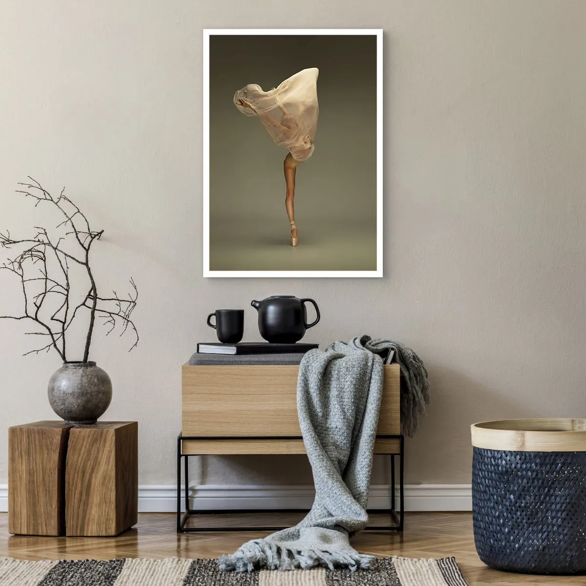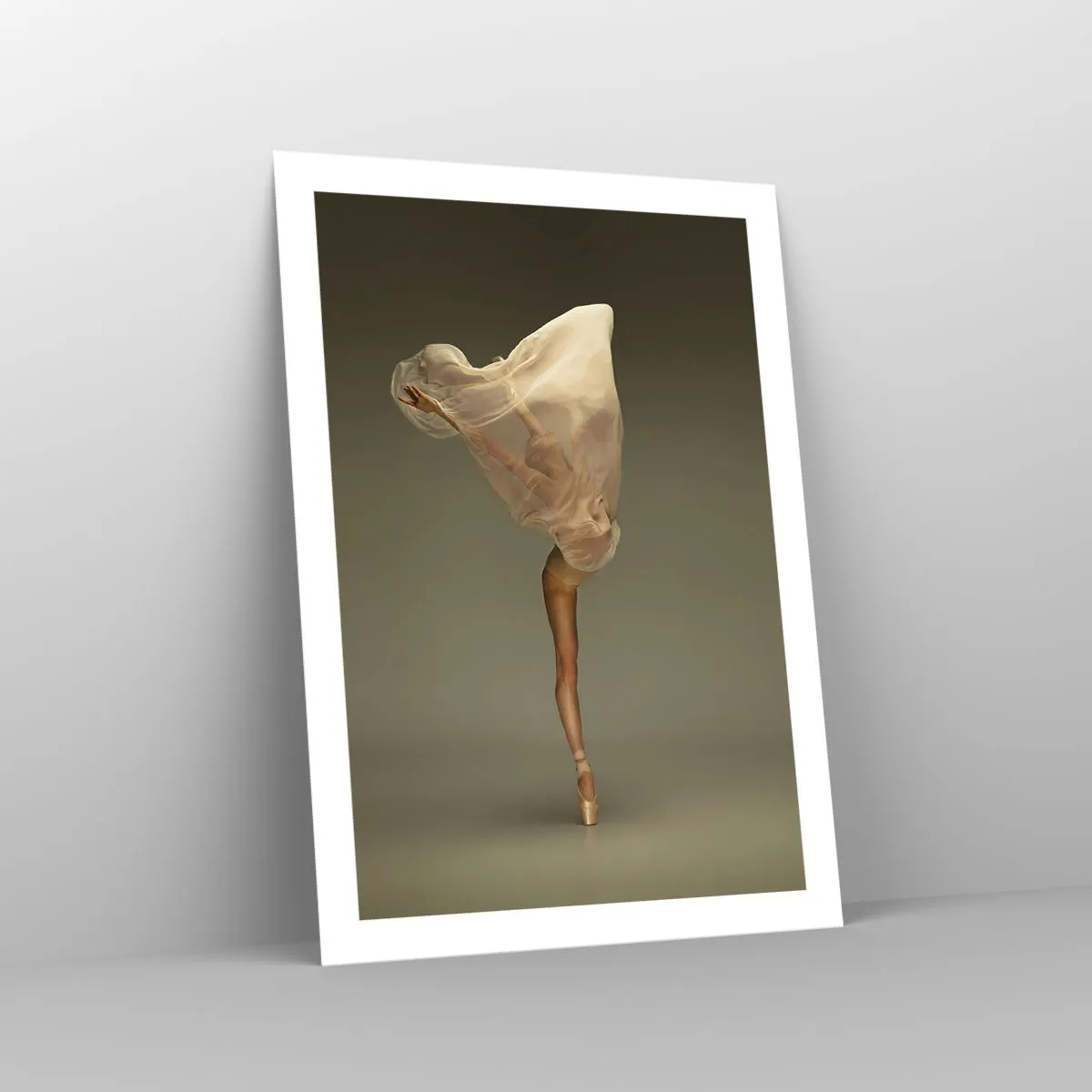 Poster - Una ballerina che danza, circondata da un tessuto delicato, in una posa discreta. - 50x70cm - Adesso vola via - Decorazione murale moderna per soggiorno e camera da letto ARTTOR