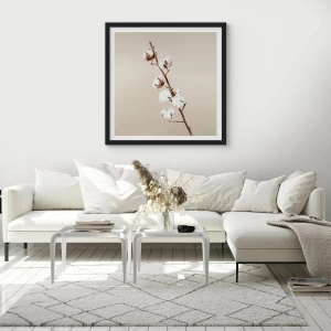 Poster in cornice nera - Un rametto di cotone su uno sfondo beige - 70x50cm - Alla fonte della morbidezza - Decorazione murale moderna per soggiorno e camera da letto ARTTOR