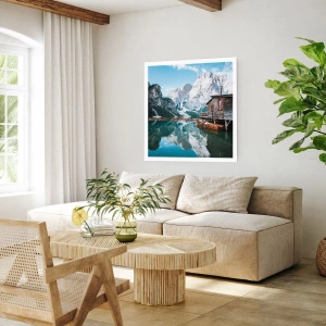 Poster - Casa di legno su un lago di montagna - 50x70cm - Mattina cristallina sui monti - Decorazione murale moderna per soggiorno e camera da letto ARTTOR