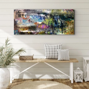 La tavolozza dei colori dell'opera è intensa e diversificata, portando energia positiva all'interno e ravvivandone lo spazio. La combinazione di testo e forme astratte conferisce al dipinto un carattere unico che si integra perfettamente con gli interni moderni.