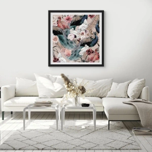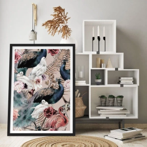 Poster in cornice nera - Un paesaggio con piume di pavone, rose e uccelli in stile romantico. - 70x50cm - Nel giardino del palazzo - Decorazione murale moderna per soggiorno e camera da letto ARTTOR