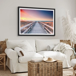 Poster in cornice nera - Un molo di legno che conduce alla spiaggia al tramonto, con il cielo dipinto di colori pastello. - 70x50cm - Aurora serale baltica - Decorazione murale moderna per soggiorno e camera da letto ARTTOR