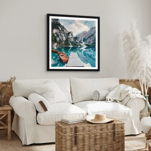 Poster in cornice nera - Un lago con barche circondato da montagne - 70x50cm - Ti mostriamo la bellezza - Decorazione murale moderna per soggiorno e camera da letto ARTTOR