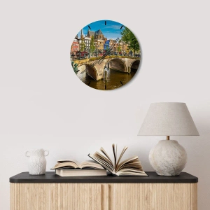 - Un orologio decorativo con il motivo di un ponte su un canale circondato da pittoreschi edifici e biciclette, perfetto per gli amanti dei paesaggi europei.