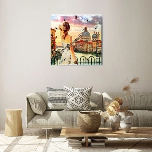 Orologio da parete - Orologio in Vetro - Una donna ammira un pittoresco tramonto su Venezia - 30x30cm - Se un'avventura allora solo a... - Decorazione murale moderna per soggiorno, cucina e camera da letto ARTTOR