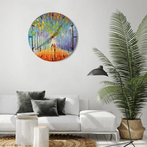 L'orologio da parete "Canto notturno della pioggia" è un elemento decorativo unico che unisce espressione artistica e funzionalità. Il quadrante dell'orologio raffigura un pittoresco viale con alberi colorati, delicatamente illuminato da lanterne, con una figura che cammina in lontananza.