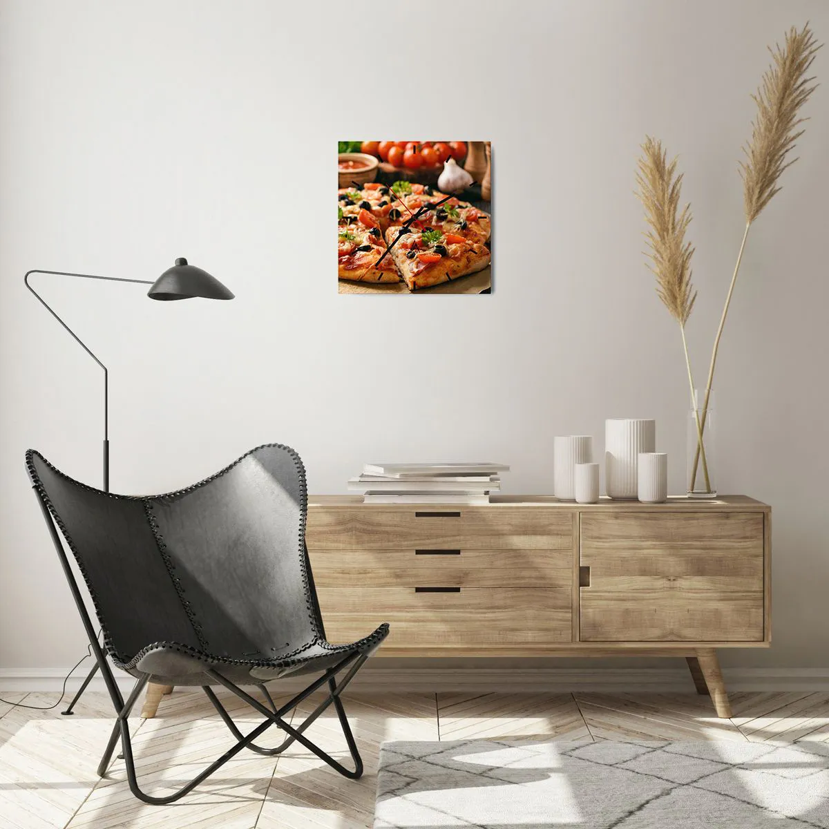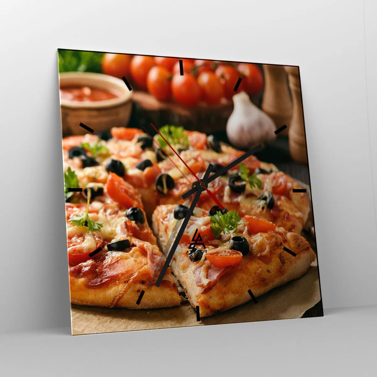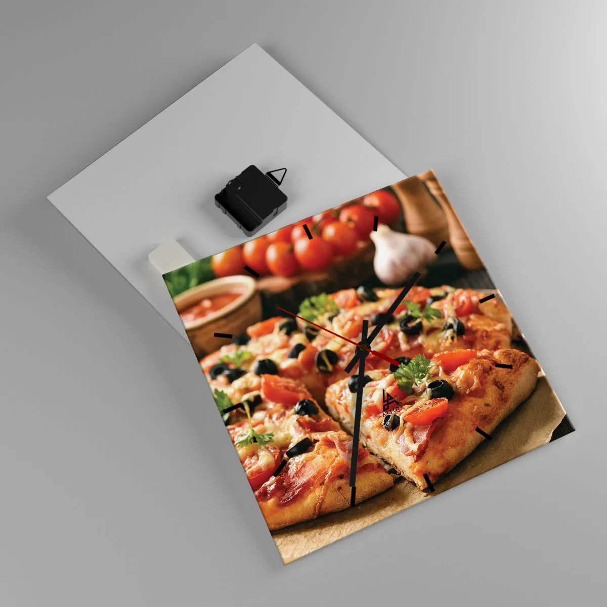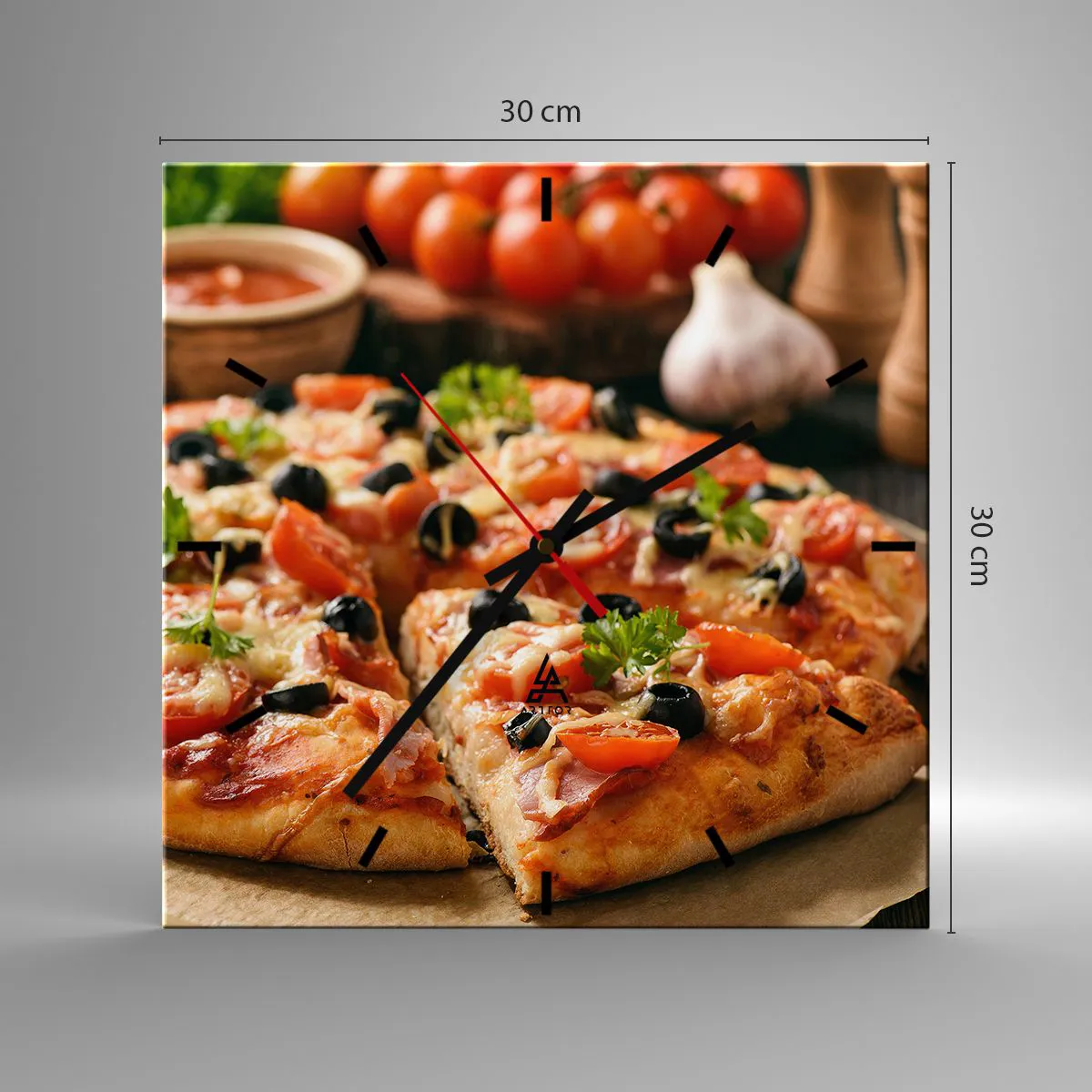 Orologio da parete - Orologio in Vetro - Pizza con pomodori, olive ed erbe fresche sul tavolo - 30x30cm - Te la sei nuovamente cavata - Decorazione murale moderna per soggiorno e camera da letto ARTTOR