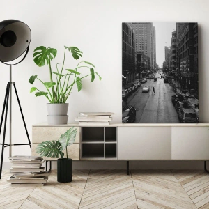 - Questa stampa su tela 70x50 cm raffigura una scena urbana in bianco e nero con una strada, auto e pedoni. Una composizione elegante e minimalista, perfetta per interni moderni.