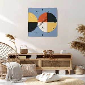 L'orologio da parete "Guarda e conta" è un design unico dominato da una geometria ordinata e da un'armoniosa combinazione di colori. La composizione di semicerchi e quadrati colorati nei toni del blu, giallo, mattone e nero attira l'attenzione e conferisce allo spazio un carattere moderno e artistico.
