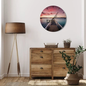 - Questo artistico orologio da parete 30x30 cm raffigura un molo su un lago tranquillo al tramonto. Realizzato in vetro, è rotondo e perfetto per interni romantici, naturali e tranquilli.