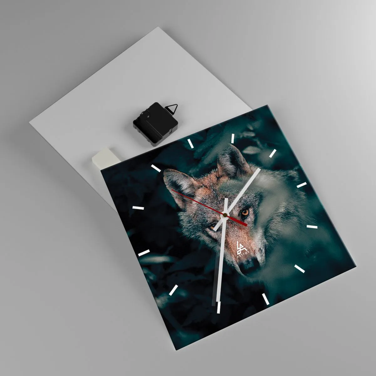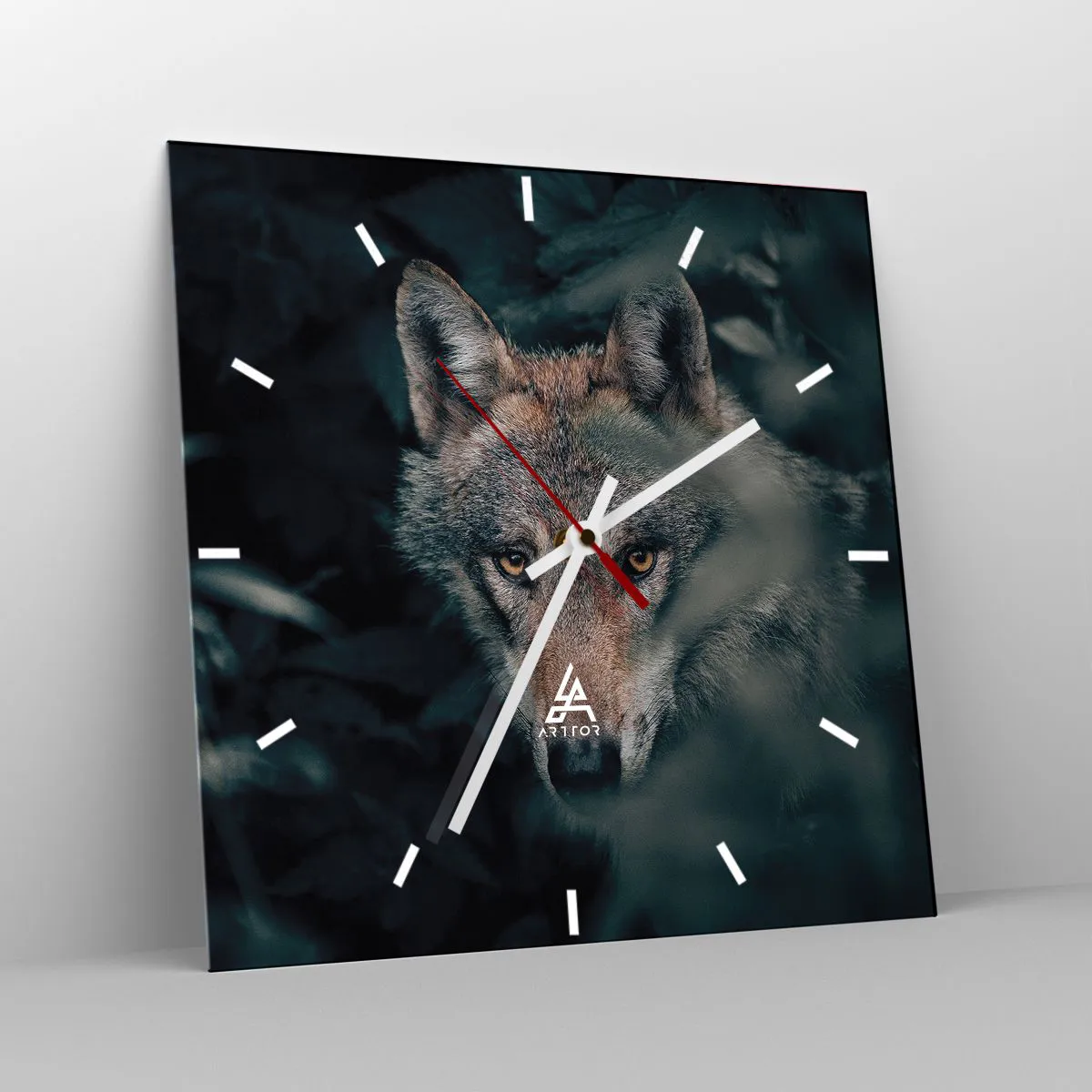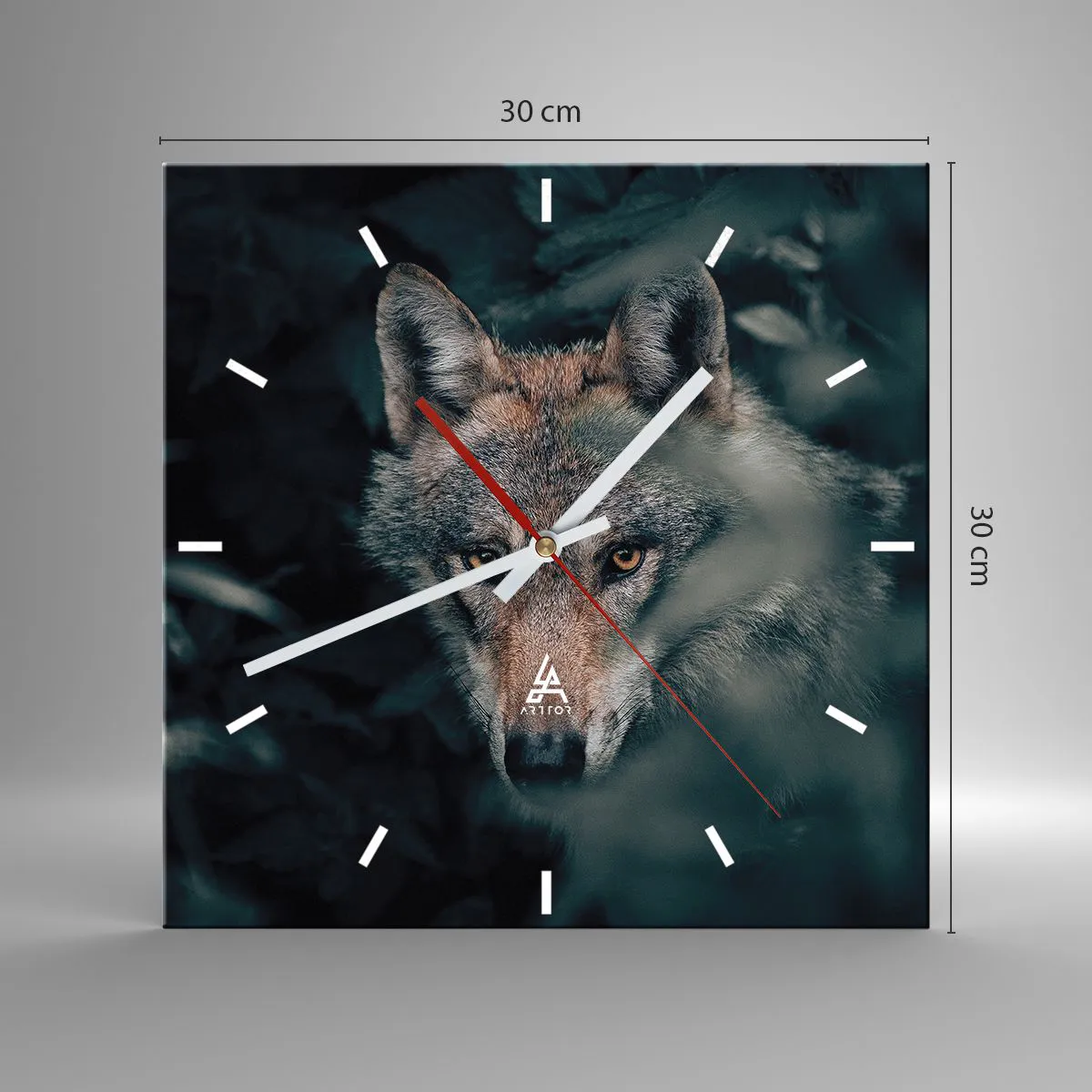 Orologio da parete - Orologio in Vetro - Un lupo nel suo ambiente naturale, che osserva dalle profondità della foresta. - 30x30cm - Cacciatore - Decorazione murale moderna per soggiorno e camera da letto ARTTOR