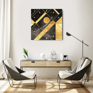 - Questo orologio da parete presenta una composizione astratta di forme geometriche dorate su sfondo nero. Un design unico ispirato al sole del deserto, perfetto per interni eleganti.