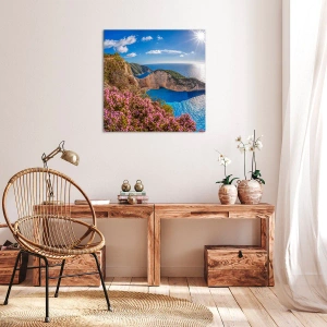 - Un paesaggio greco con una pittoresca scogliera, mare turchese e sole splendente, incorniciato da delicati fiori. Il dipinto trasuda l'armonia e la bellezza della natura, integrandosi perfettamente con gli interni di ispirazione mediterranea.