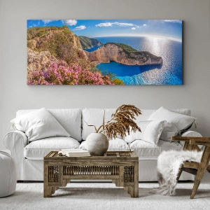 Quadro su tela - Stampe su Tela - Una scogliera con fiori, un mare turchese e un soleggiato paesaggio greco - 70x50cm - Le mie grosse vacanze greche - Decorazione murale moderna per soggiorno e camera da letto ARTTOR
