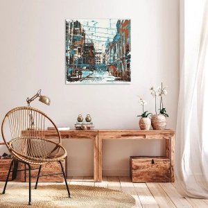Il paesaggio urbano nei toni del blu e dell'arancione è anche un'idea regalo ideale per gli amanti dell'atmosfera urbana e dell'interior design moderno. Quest'opera d'arte porta energia, creatività ed espressione artistica ai vostri interni.