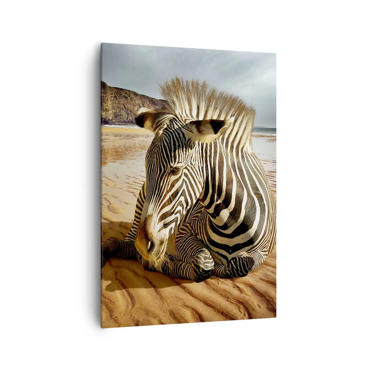 Quadro su tela - Stampe su Tela - Una zebra che riposa su una spiaggia sabbiosa con scogliere sullo sfondo. - 70x100cm - Fatti l'uno per l'altra - Decorazione murale moderna per soggiorno e camera da letto ARTTOR